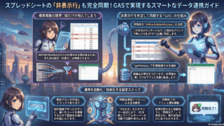 GAS 【GAS】IMPORTRANGEで非表示の行が反映されない問題を解決!「見たまま」同期する方法 今回はIMPORTRANGEの動画のコメントで非表示にした行は反映されるかとお問い合わせいただいたので検証した結果を記事にしてみました。Googleスプレッドシートで『IMPORTRANGE』を使っている皆さん。こんな悩みはありませんか?」... 2026.04.20 GASスプレッドシート