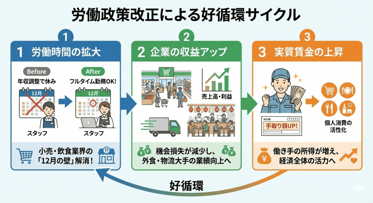 - 労働時間の拡大: これまで「年収を抑えるために12月に仕事を休む」というスタッフに悩まされていた小売・飲食業界にとって、この改正は大きな追い風です。
