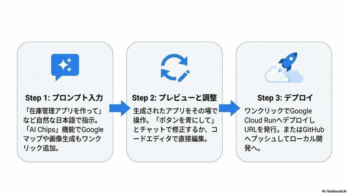 Google AI Studioは、プログラミング知識がなくても、日本語で指示するだけで実用的なWebアプリやツールを作れる革新的なプラットフォームです。