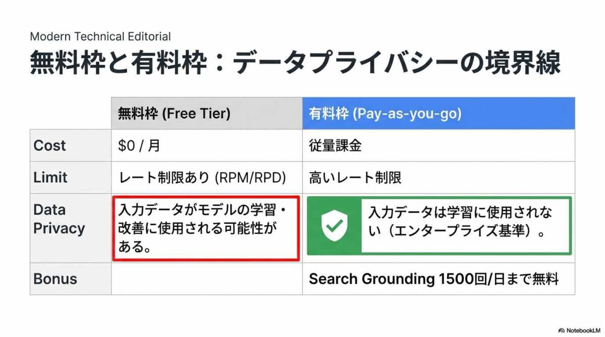有料プランにアップグレードすると、入力したデータはGoogleのモデル改善には使われなくなります。機密性の高いデータを扱う場合は、この方法が推奨されます。