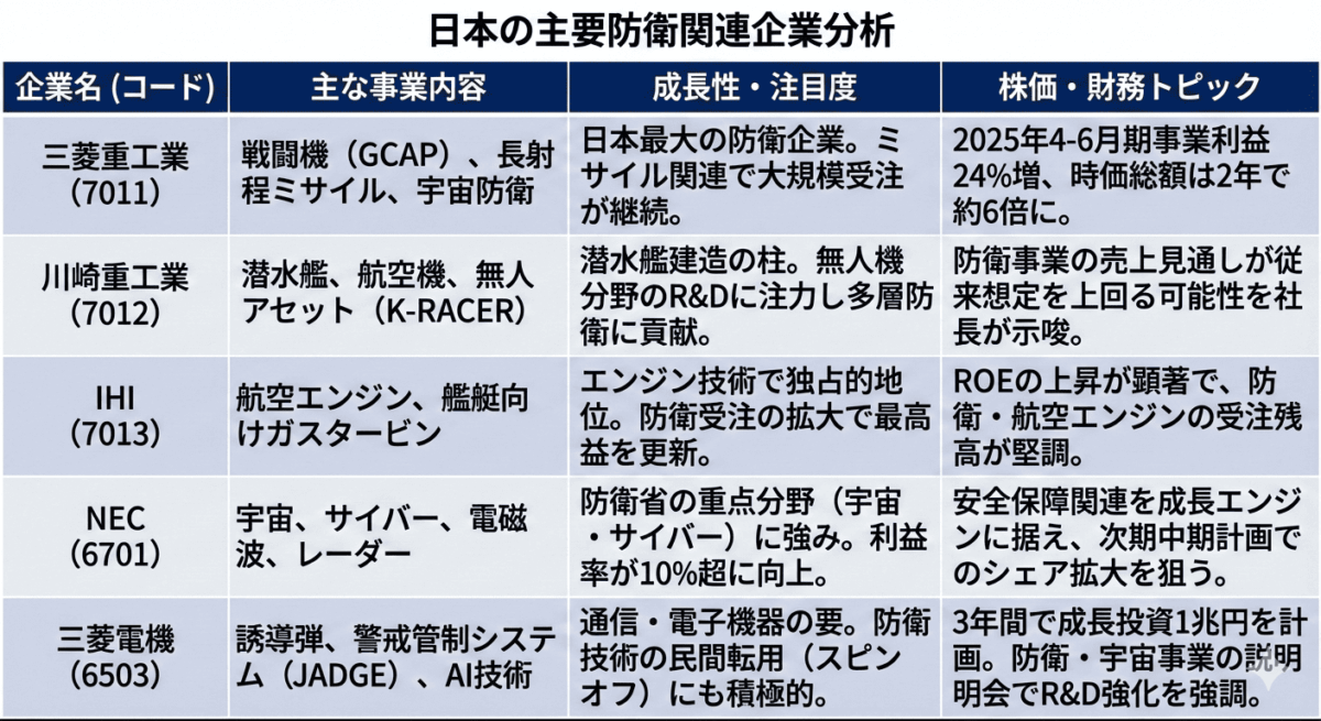 日本の防衛装備品生産は、5つの大型企業を中心に展開されています。各社の戦略と成長性を見てみましょう。