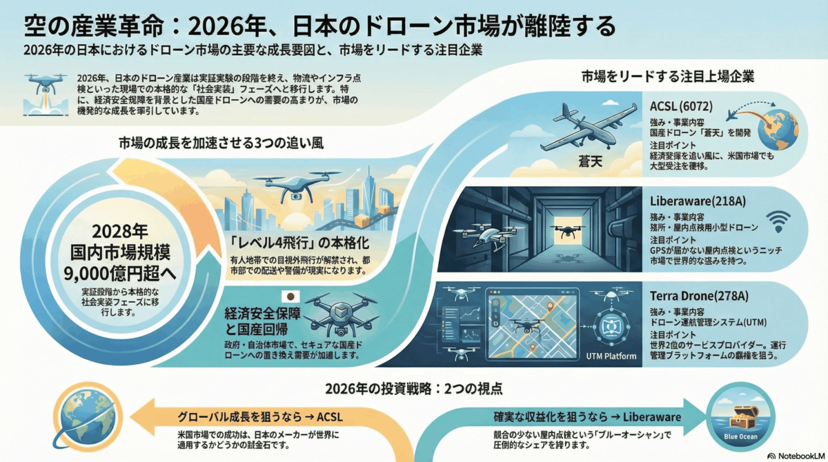 - 経済安全保障: 中国製ドローンの排除が進む政府・自治体市場において、ACSLやLiberawareなどの「セキュアな国産機」への置き換え需要が加速しています。