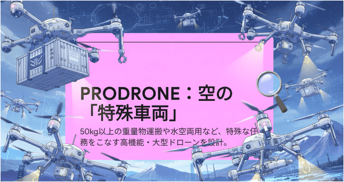- 強み: 50kg以上の重量物を運べる大型機や、水空両用機などの「高機能・大型機」の設計能力。
