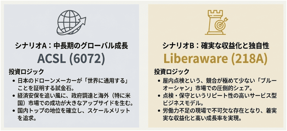 - 「中長期のグローバル成長」を狙うなら: ACSL。米国市場での成功は、日本のドローンメーカーが「世界に通用する」ことを証明する試金石となります。