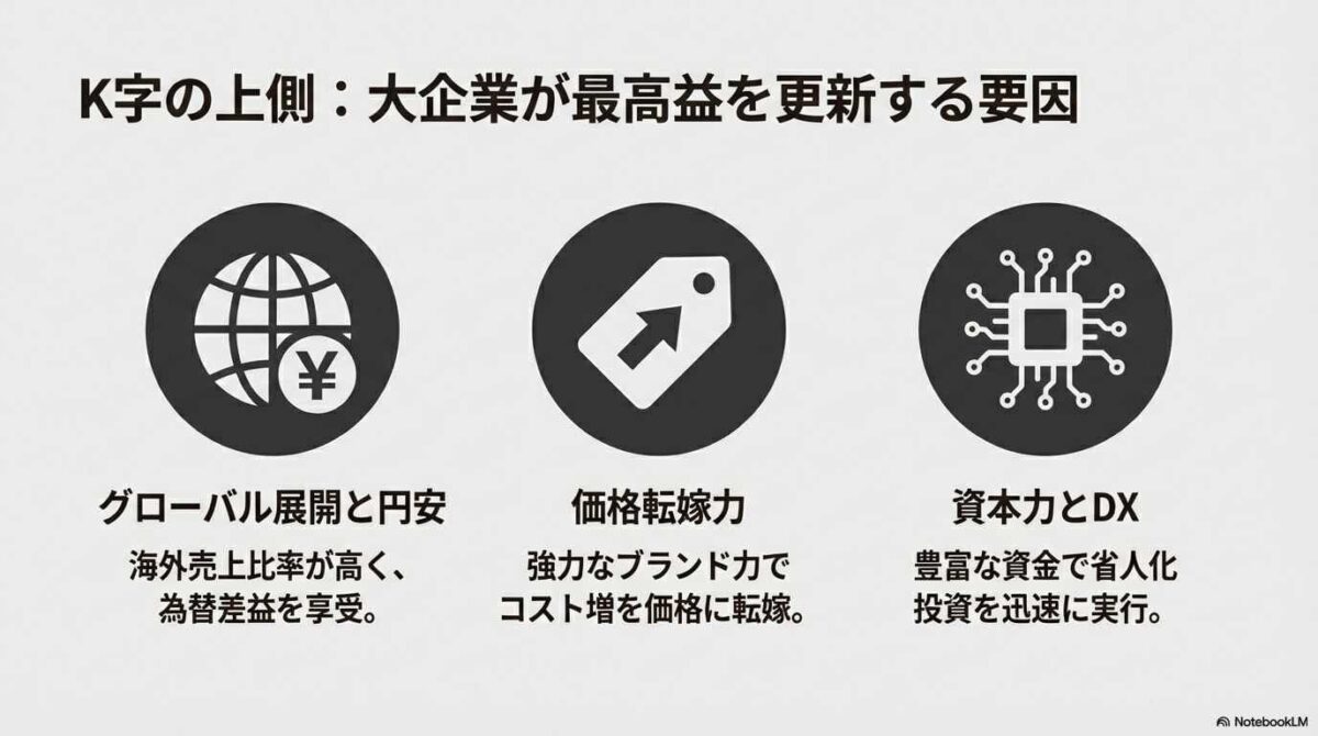 コロナ禍の出口で見られた「K字型回復」は、いまや一過性のリバウンドを超え、日本経済の「冷徹な構造」として定着しました。好調な「K字の上向き」を独走する大企業には、強固な生存戦略が備わっています。