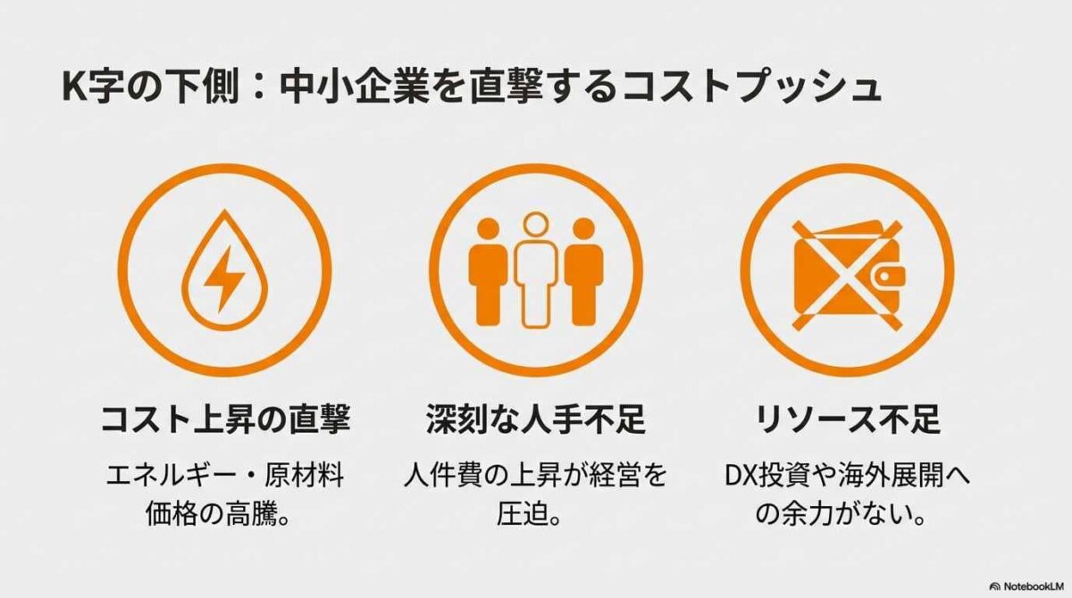 一方で「K字の下向き」に沈む中小企業の多くは、自力では制御不能なコストプッシュ・インフレの直撃を受ける「構造的な被害者」と言えます。彼らの行く手を阻むのは、単なる不況ではなく、以下の三つの要素から成る「見えない壁」です。