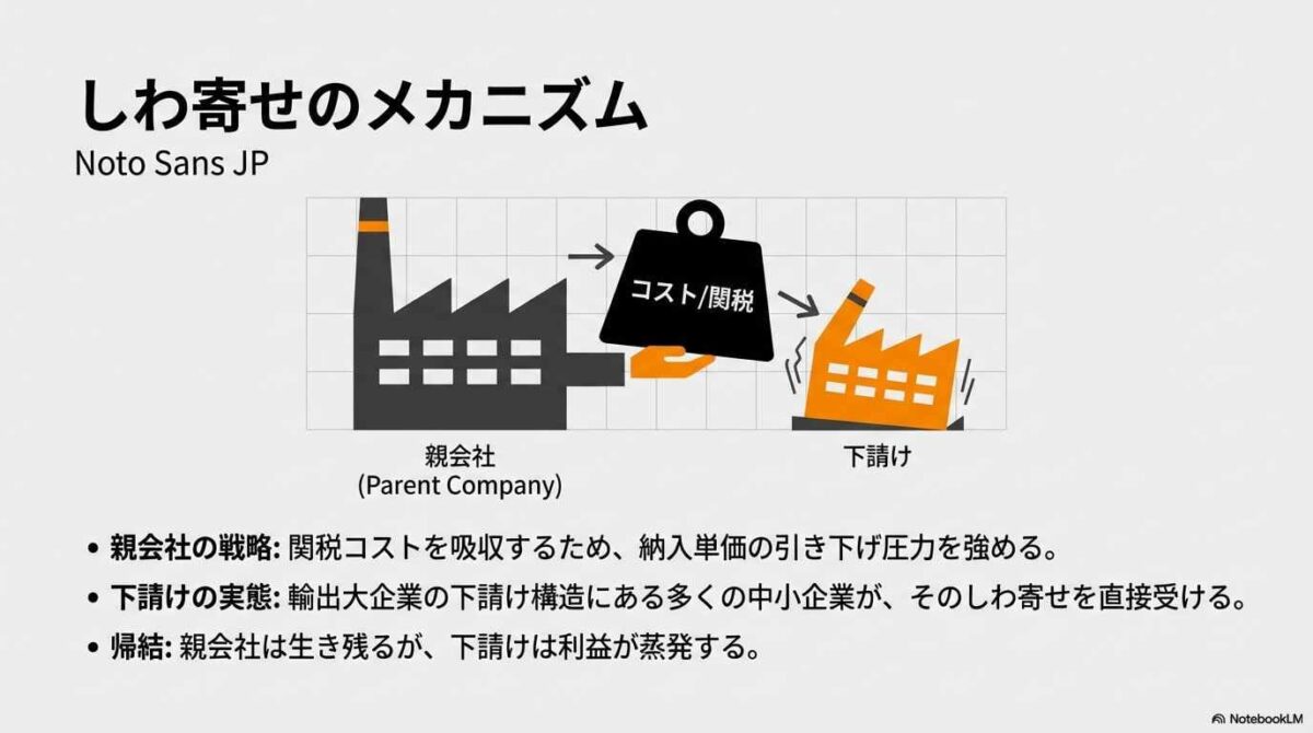 グローバル巨人は、関税リスクに対して拠点の分散や高度なロビー活動、サプライチェーンの再編といった「機動力(アジリティ)」を行使して生き残りを図ります。しかし、そのコストを最終的に負担するのは、彼らの足元を支える中小企業という「衝撃吸収材(ショックアブソーバー)」に他なりません。