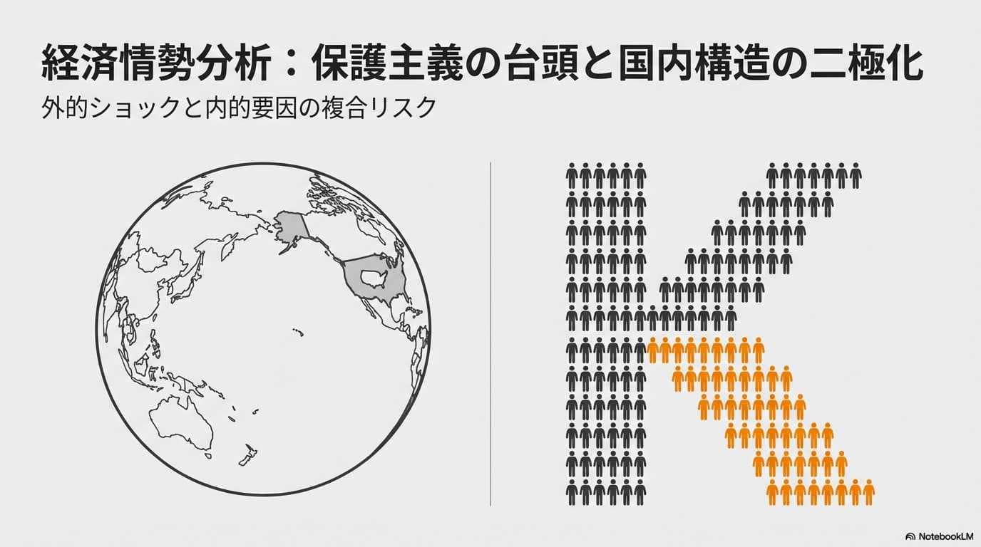 現在、日本経済では「K字型」と呼ばれる鮮明な分断が進行しています。そして、この格差を単なる好不調の差から、逃れられない「構造的な罠」へと変質させているのが、米国の保護主義という強力な外圧です。